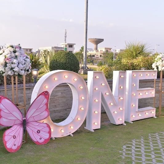 Create rooftop magic with this stunning butterfly-themed setup that transforms any outdoor space into an enchanted garden paradise. Giant marquee letters spelling “ONE” become the focal point, adorned with warm LED bulbs that twinkle like stars against the evening sky. The oversized pink butterfly adds whimsical charm while delicate floral arrangements frame the entire display beautifully.