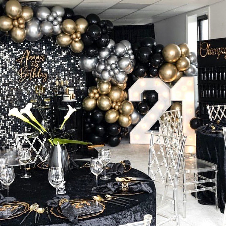 11.Glamorous Black and Gold Milestone Outdoor Birthday Party