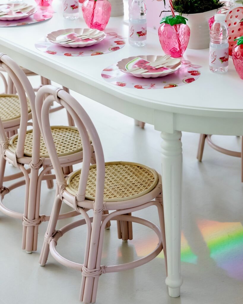 Create a charming strawberry-themed celebration with this delightful outdoor birthday party idea that brings summer sweetness to your backyard gathering. The adorable strawberry-shaped cups and matching tableware transform an ordinary white table into a berry delicious party scene. Soft pink bentwood chairs add cottage charm while maintaining comfort for guests of all ages.
