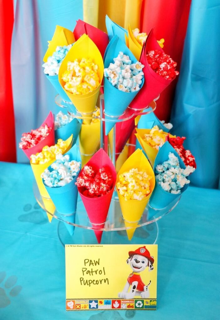 The popcorn is colored to match the pups’ uniforms. Guests can grab their own snack. It keeps the party moving and everyone happy.