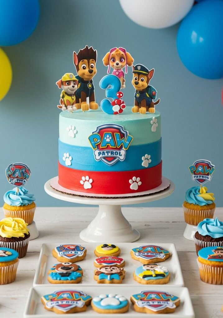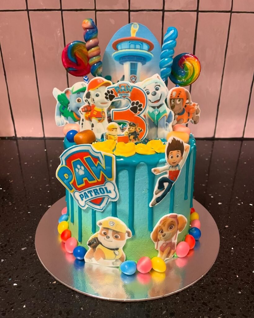 This cake is a burst of color and fun. A vibrant blue drip design cascades down the sides. It’s an exciting addition to Paw Patrol party ideas.