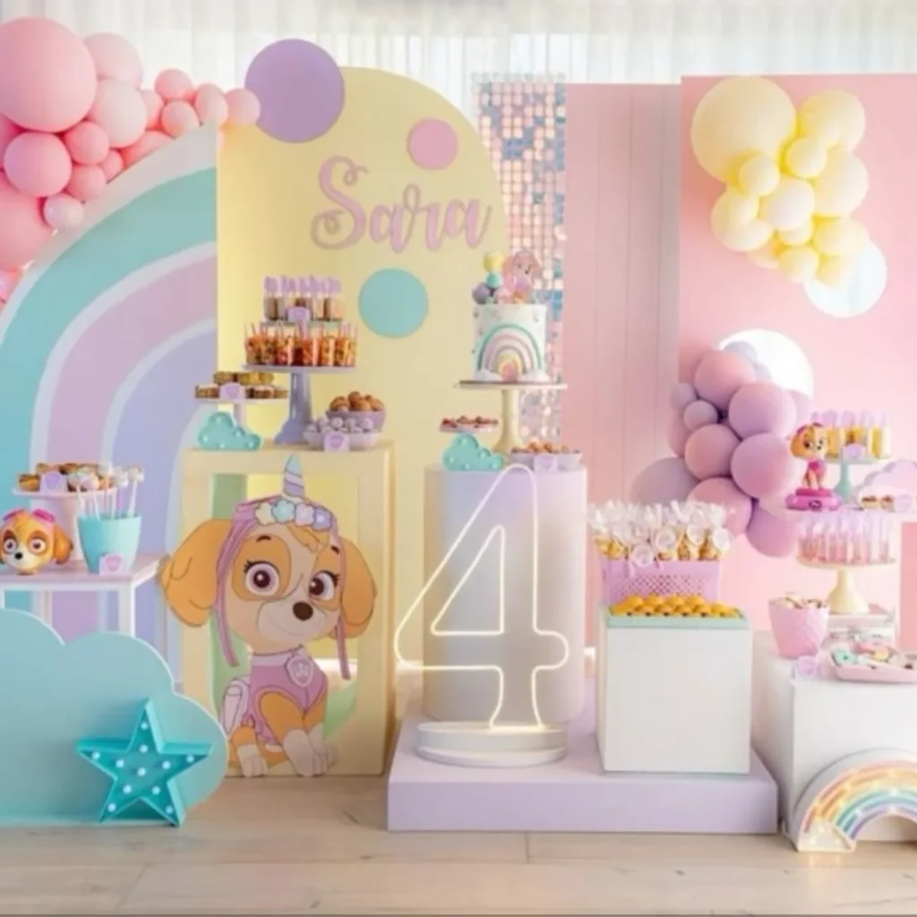 A big cutout of Skye in a unicorn horn stands out. The glowing number “4” adds a modern touch. Every detail feels magical.