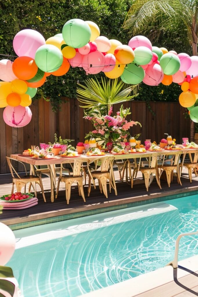 This simple yet stunning decor transforms the backyard into a beautiful, playful space. It’s a great way to make a big visual impact for your pool party without complex setups.