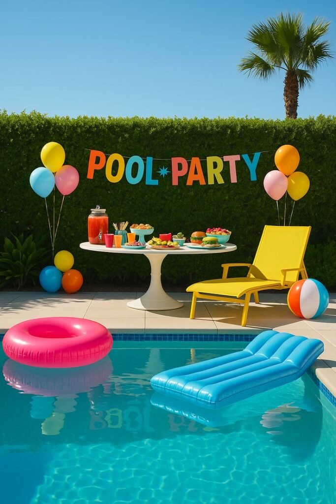 This vibrant pool party setup is a beacon of summer fun. A colorful “Pool Party” banner and bright balloons create a cheerful and welcoming atmosphere for all guests.