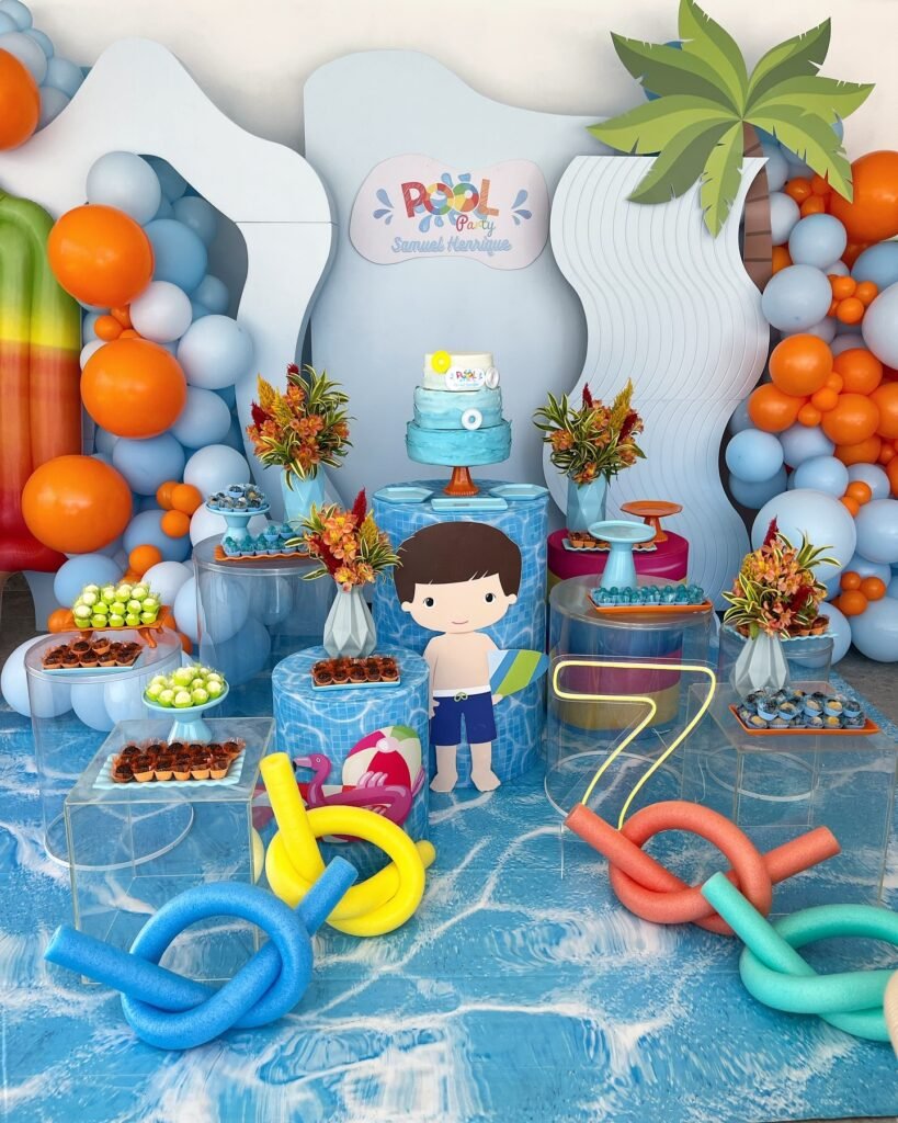 This delightful pool party dessert table is bursting with charm. A custom backdrop features a cheerful “Pool Party” sign and an adorable cartoon cutout of Samuel.