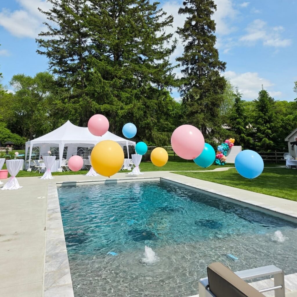 Celebrate a milestone birthday with an elegant pool party setup. Golden “40” balloons float gracefully, anchored by vibrant balloon clusters in cheerful hues.