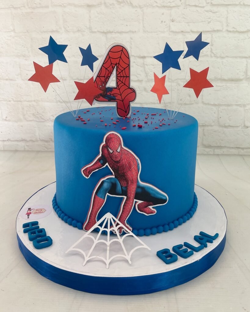 This cake is a superhero’s dream, featuring a vibrant blue background. A large cutout of Spiderman is ready for action. It’s a wonderful choice among spiderman birthday party ideas.