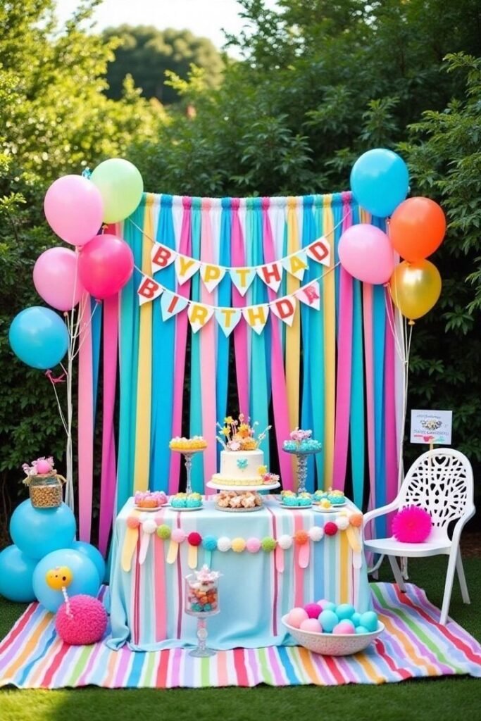 This stunning outdoor table is framed by a backdrop of bright, flowing rainbow streamers and colorful balloons. The lively vertical stripes create an instant feeling of fun and energy for the celebration.