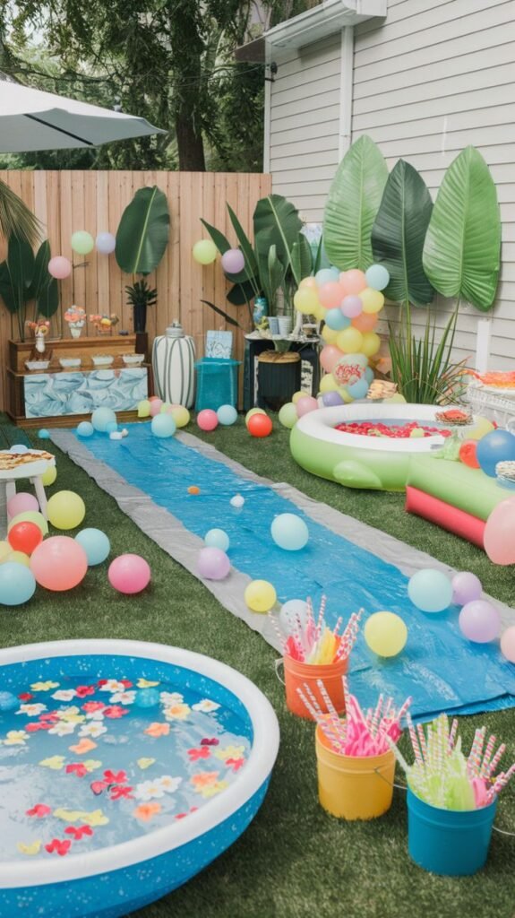 Further colorful accents, including more balloons and a striped inflatable toy, complete the backyard transformation. It is a simple yet stunning way to turn any outdoor space into a joyful water themed celebration.