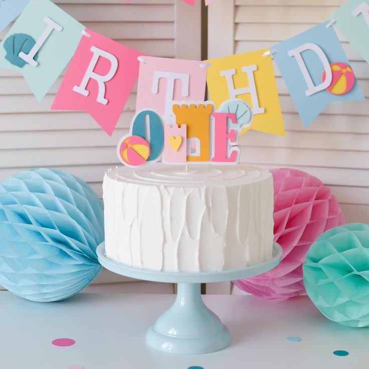 This sweet white cake is elegantly topped with a custom “ONE” banner. The letters feature charming elements like a beach ball and a sandcastle cutout, making it festive. It is simple, yet totally adorable.