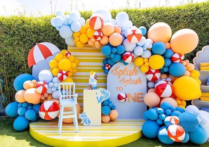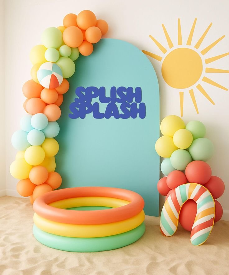 This vibrant, eye-catching setup is everything you need for a memorable splish splash birthday party. A brilliant balloon arch in tropical colors creates an inviting entrance. The cheerful blue background and the bold “SPLISH SPLASH” sign promise non stop fun.