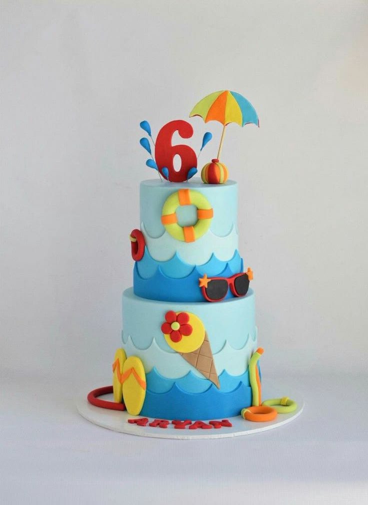 Look at the amazing fondant details that perfectly capture the spirit of the season. A life preserver, cool sunglasses, and a colorful umbrella top the cake. The number six shows a fun water splash.