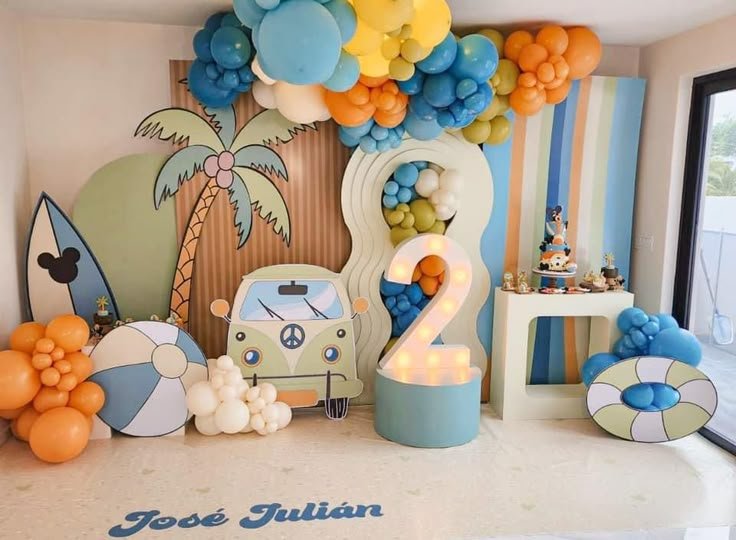 This fantastic setup brings a fun, retro beach vibe indoors for a splish splash birthday party. Large cutouts feature a classic palm tree, a surfboard, and a groovy VW bus. The backdrop has cool vertical stripes.