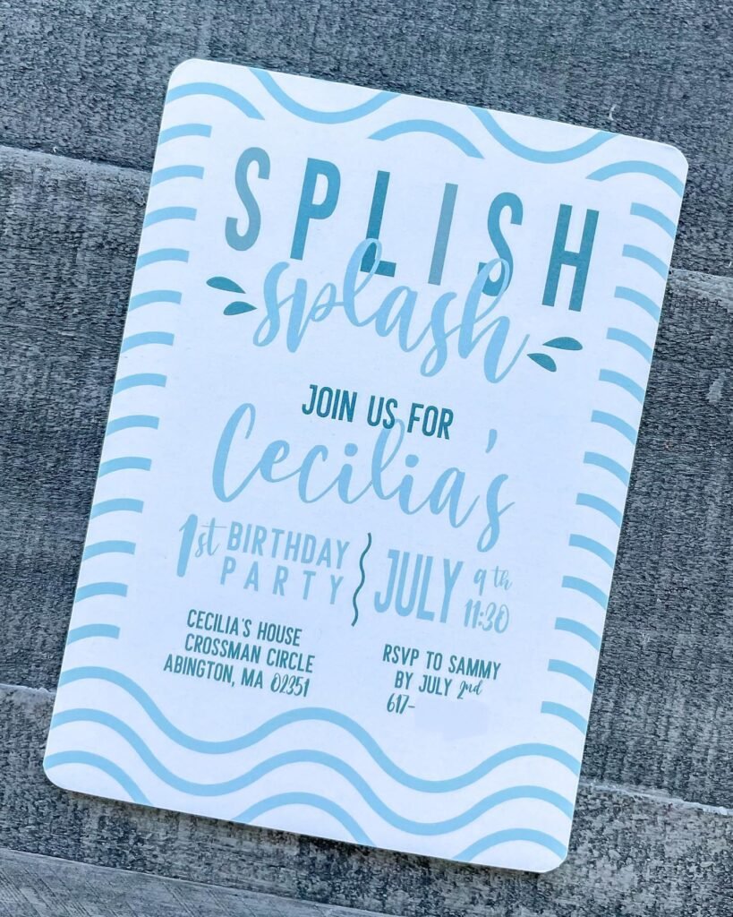 This sweet invitation uses calming blue and white wave borders to set a gentle, water themed mood. The clear typography announces a fun splish splash birthday party for Cecilia’s first year.