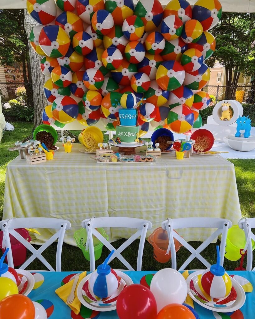 The party table immediately grabs attention with a cheerful, towering wall of inflatable beach balls. This vibrant backdrop is a spectacular and economical way to create a huge visual impact. It sets a lively, fun mood for the celebration.