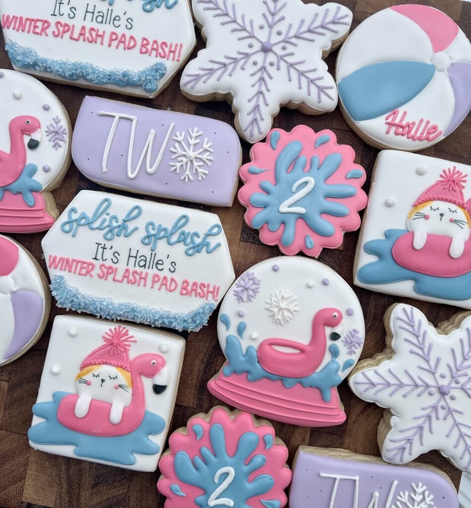 Rectangular cookies announce “Halle’s Winter Splash Pad Bash,” confirming the creative, unique theme. These detailed, custom treats are a sweet way to celebrate any cool weather birthday.