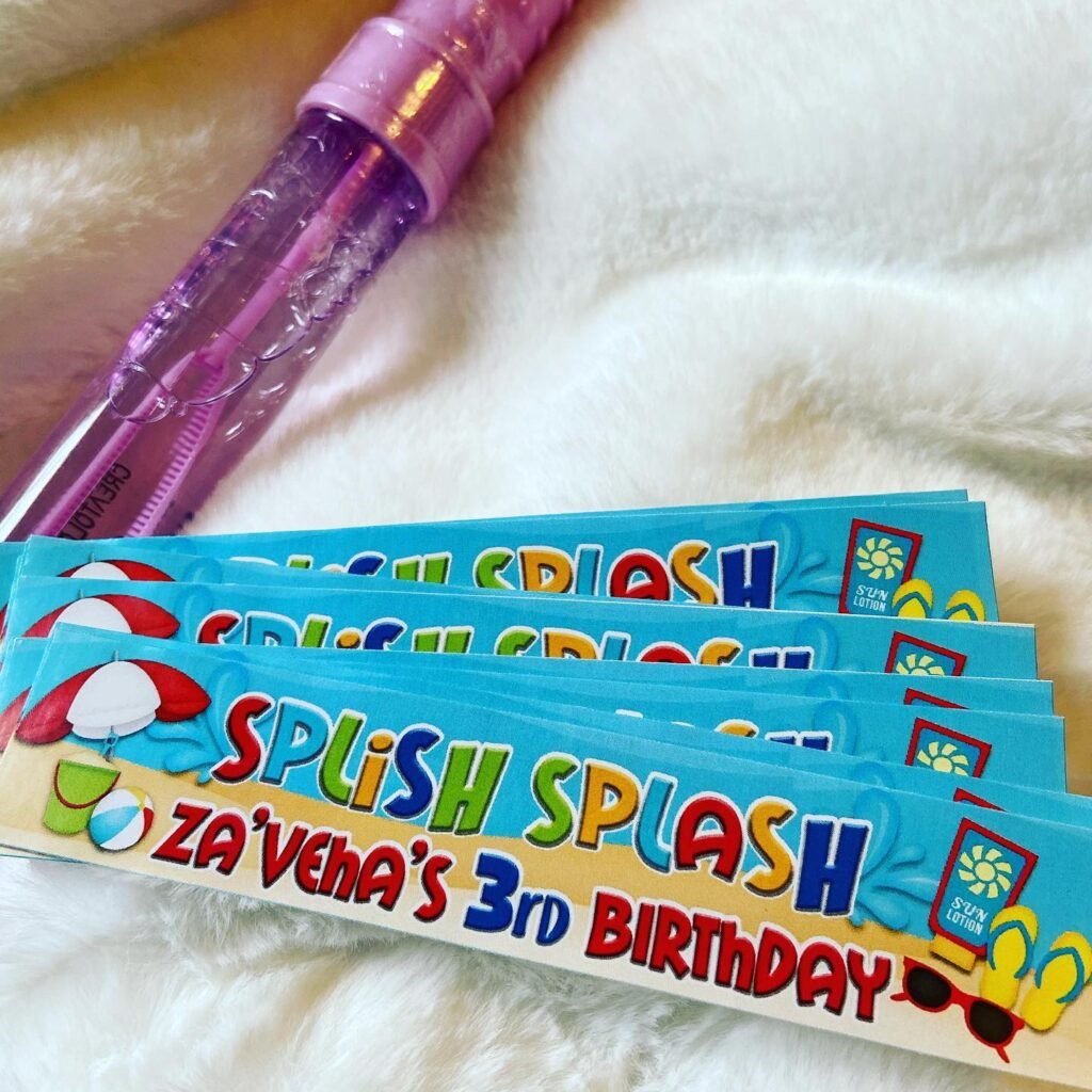 The bold “SPLISH SPLASH” text pops against the blue background, which mimics clear water. Lying on a soft, white surface next to a bubble wand, the labels look cute and practical.