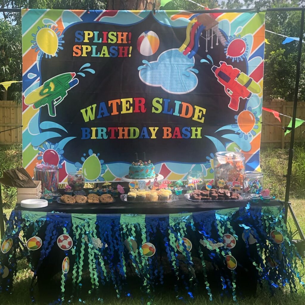 This outdoor table is set up for a fun “Water Slide Birthday Bash,” using a colorful, cartoon banner backdrop. The theme is clear with graphics of squirt guns and splashing water.