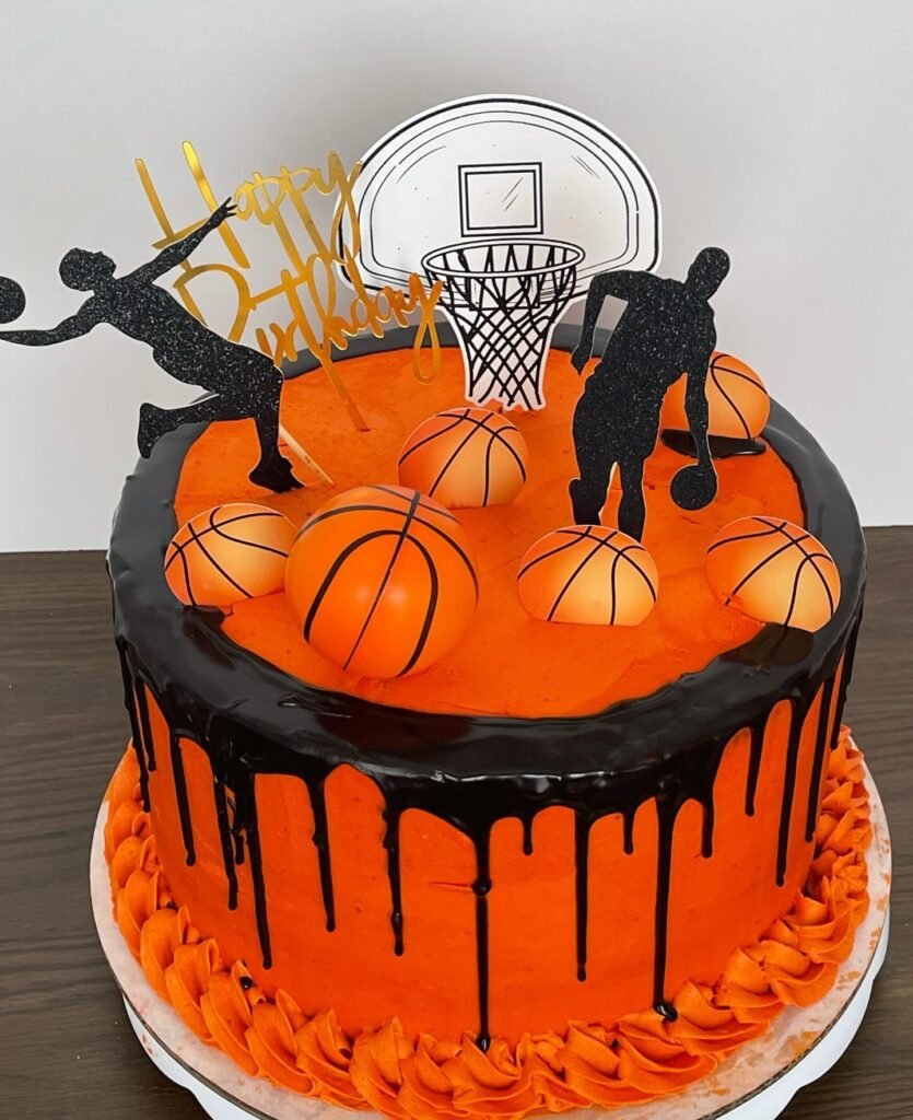 This vibrant cake is an absolute slam dunk for a sports birthday party, especially for basketball enthusiasts. Its striking orange frosting serves as the court, beautifully contrasted by a rich, glossy black drip cascading down the sides. This bold color scheme immediately sets an energetic tone.