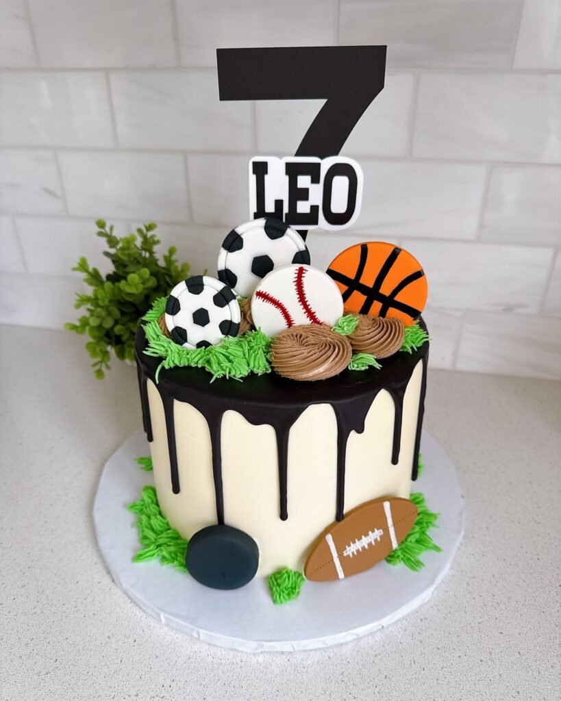 Completing the design is a shining gold “Happy Birthday” topper, adding a festive shimmer. This cake’s playful yet stylish design makes it an exciting and memorable centerpiece for any sports birthday party.