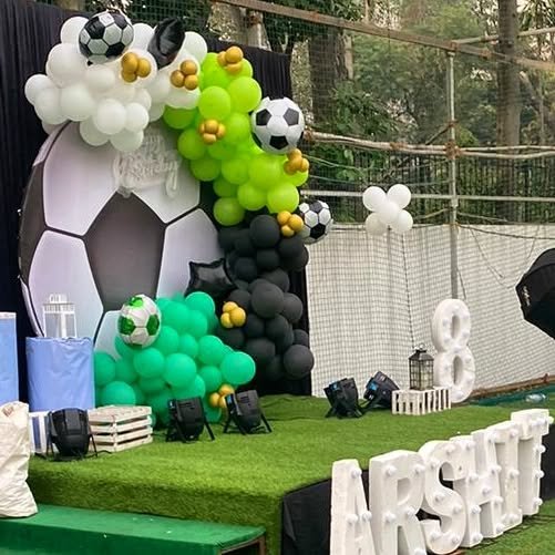 The party area is grounded by lush artificial turf, mimicking a real soccer field, inviting guests to play. Prominently featured are illuminated letters spelling out “ARSHIT” and a large number “8,” personalizing the celebration for the birthday boy and his age.