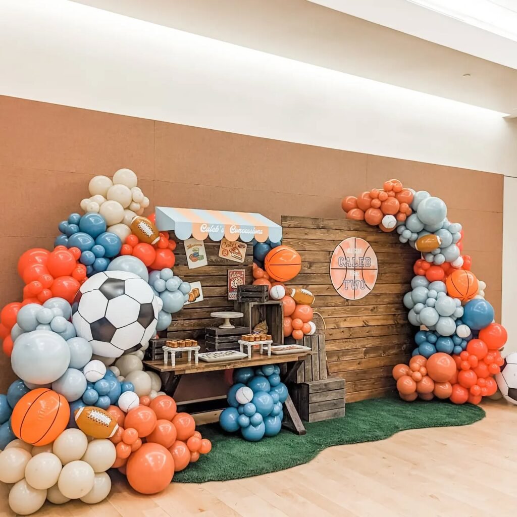 Prepare for an unforgettable sports birthday party with this impressive themed backdrop. A sprawling balloon garland, in hues of light blue, cream, and vibrant orange, frames a rustic wooden wall. This eye catching arrangement is dotted with oversized inflatable footballs, basketballs, and a prominent soccer ball, immediately setting a playful, athletic mood.