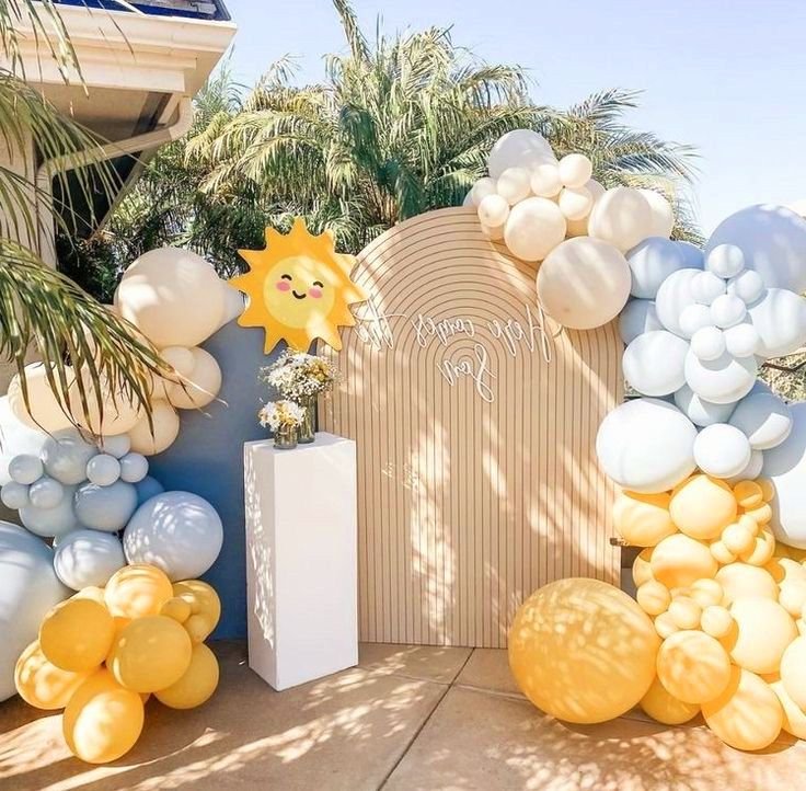 Bright yellow and white balloons, along with charming sun cutouts, bring the sunshine theme to life. Floral arrangements and unique props like a tiny motorcycle complete the festive look. Every detail contributes to a welcoming and celebratory space.