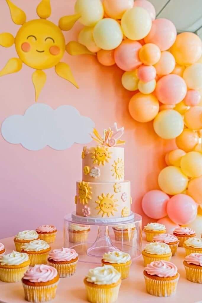 Surrounding the cake, an abundance of cupcakes with pink, white, and yellow frosting are neatly arranged, offering a delicious treat for every guest. A large, grinning sun cutout and a white cloud adorn the peachy backdrop, reinforcing the theme. A beautiful balloon garland in coordinating pastel colors frames the display.