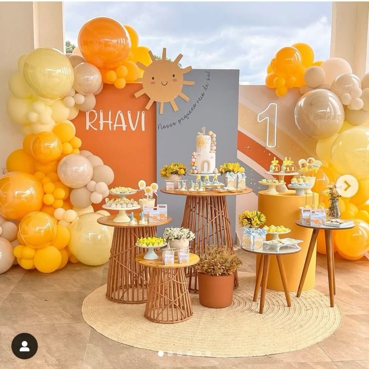 This beautifully styled corner exudes warmth and rustic charm, creating an inviting setting for a sunshine birthday party. A vibrant balloon arch in shades of yellow, orange, and cream frames a personalized backdrop. The name “Rhavi” takes prominence, adding a special touch for the guest of honor.