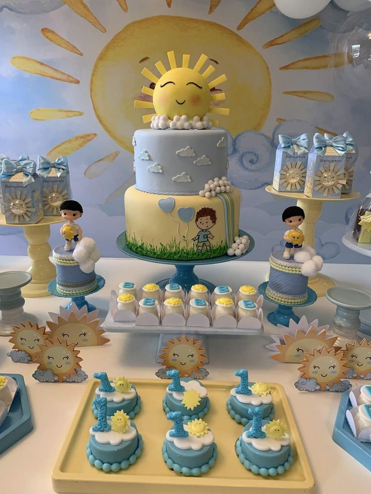 This dessert table is a sunny dream come true, making it a star attraction for any sunshine birthday party. A charming two-tiered cake crowned with a cheerful sun character takes center stage, ready to delight young guests. The blue and yellow hues perfectly capture a bright sky on a clear day.