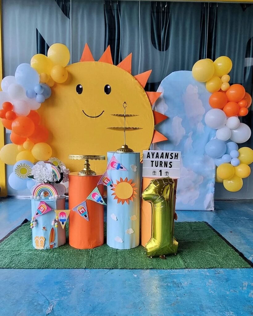 A sign announcing “Ayaansh Turns 1” personalizes the space, inviting guests to celebrate. This area provides a fantastic backdrop for capturing joyful moments and creating lasting memories. It’s a wonderful example of a dynamic sunshine birthday party display.