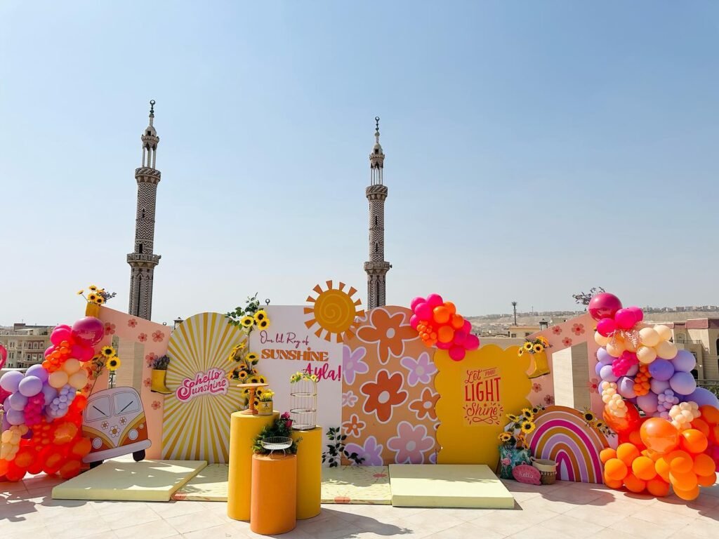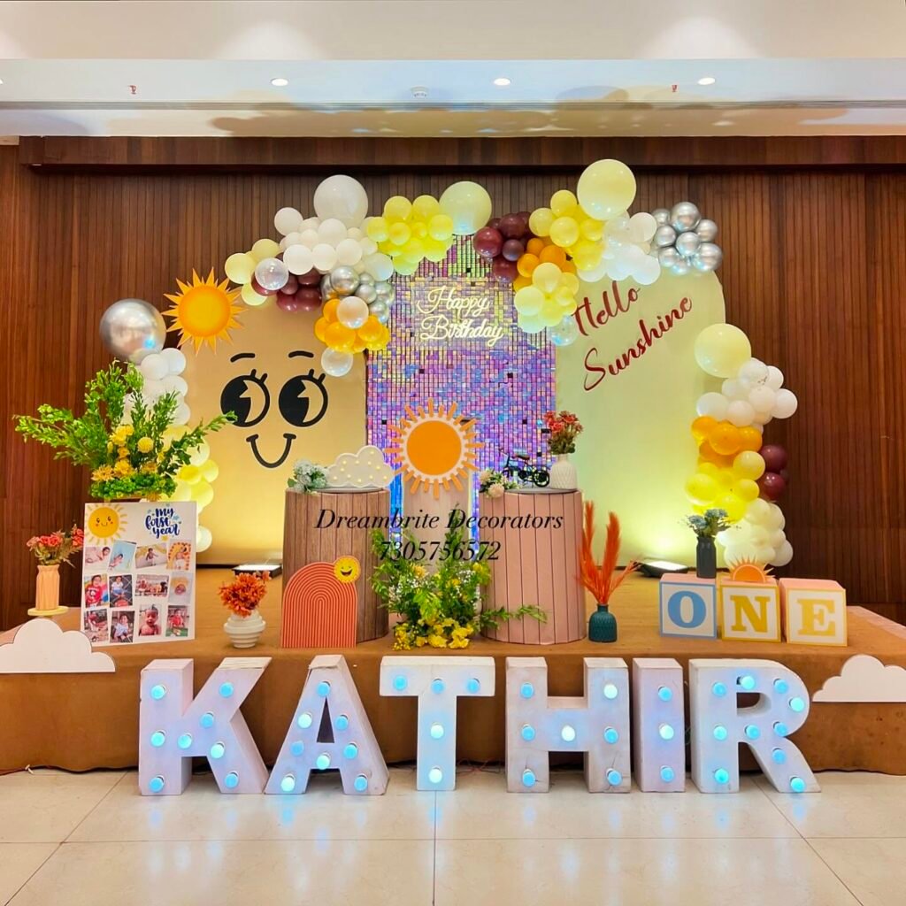 This vibrant stage setup creates a joyful atmosphere, perfect for a memorable sunshine birthday party. Large, illuminated letters spell out the guest of honor’s name, adding a personalized touch. Guests will love seeing this cheerful display as they arrive to celebrate.