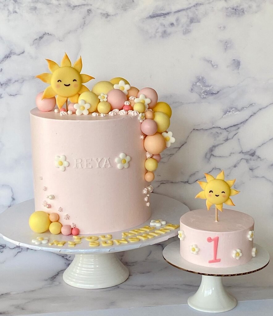 Beside it, a smaller “smash cake” echoes the main design, perfect for a little one’s first birthday celebration. It features the number “1” in pink and is topped with its own sweet smiling sun. Both cakes have tiny floral details, adding to their whimsical appeal.