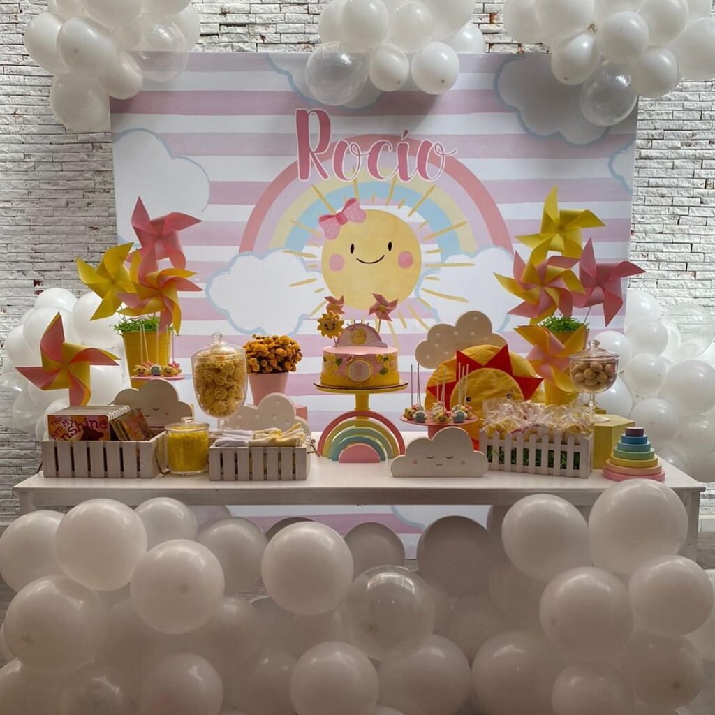 This charming dessert table embodies a playful and dreamy vibe, making it a sweet highlight for a sunshine birthday party. A backdrop featuring soft pink stripes, fluffy clouds, and a smiling sun sets a cheerful tone. The birthday child’s name, “Rocio,” is beautifully displayed.