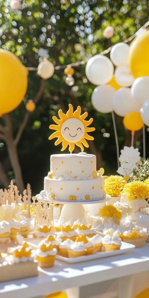 White cloud cutouts at the base complete the whimsical sky theme. Every detail, from the tiered cake to the individual cupcakes, contributes to a cohesive and inviting presentation. This setup ensures a memorable and visually stunning sunshine birthday party.