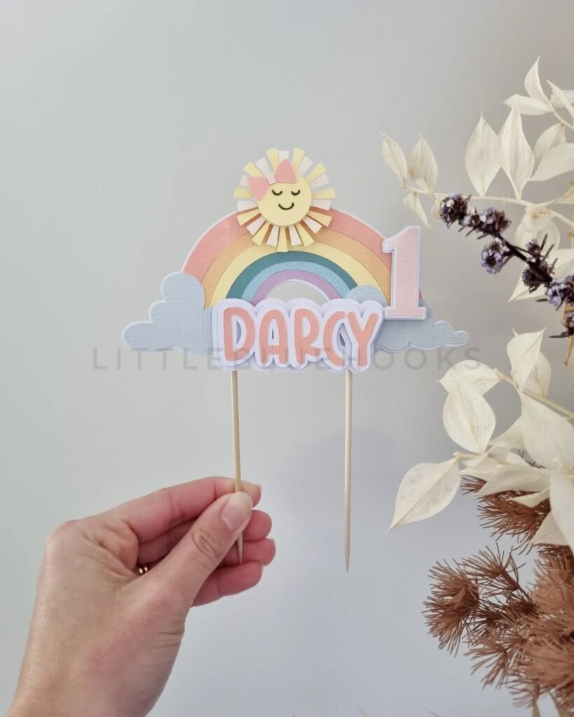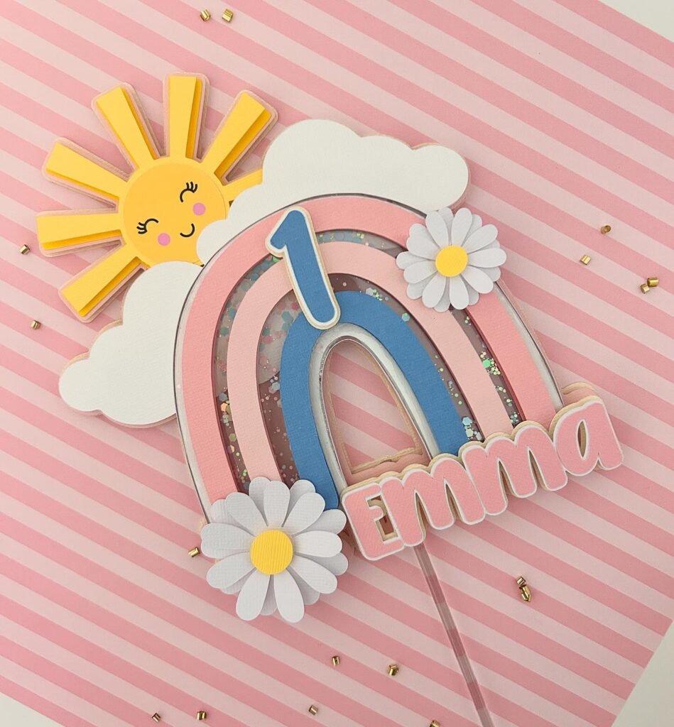 This charming cake topper is a wonderful addition to any sunshine birthday party, adding a personalized and festive touch. Featuring a cheerful sun, fluffy clouds, and a sweet rainbow, it perfectly captures a bright and happy theme. The number “1” clearly marks a special first birthday celebration.