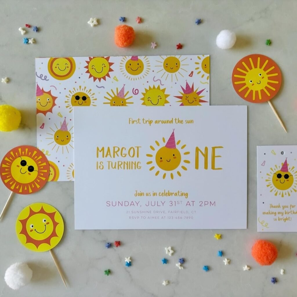 These adorable invitations and coordinating stationery set the perfect tone for a bright sunshine birthday party. The main invitation announces “Margot is Turning One” with a cute sun wearing a party hat, inviting guests to “First trip around the sun.” All the essential party details are clearly presented.