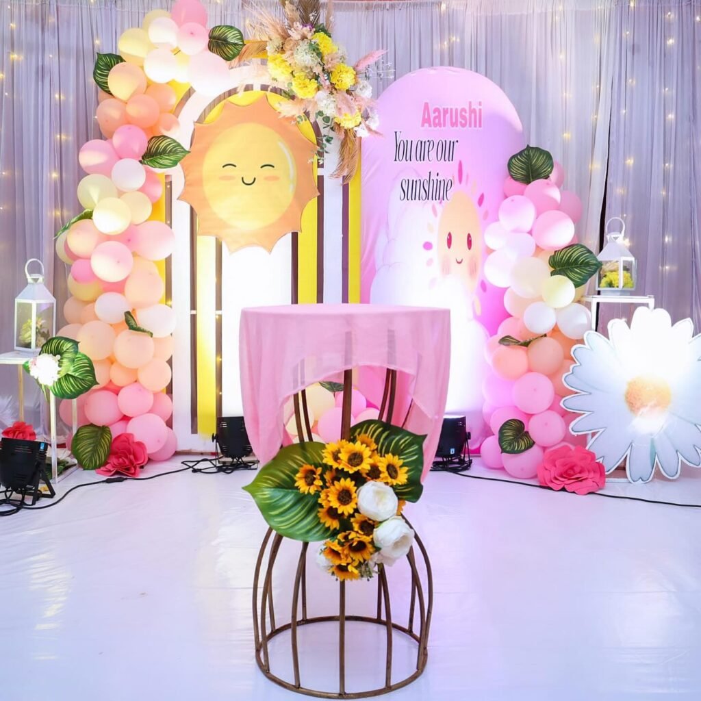 A large, smiling sun cutout anchors one side, while a round backdrop with the sweet message “Aarushi, You are our sunshine” personalizes the space. The soft lighting draped behind sheer curtains adds a magical glow. A stylish high chair, adorned with sunflowers, is ready for the birthday star.