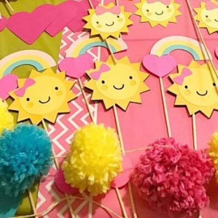 Alongside the suns, there are also little rainbows and pink hearts, creating a cohesive and lovable design. These elements work together to emphasize a cheerful and positive atmosphere. Vibrant pom-poms in yellow, pink, and blue add texture and color to the display.