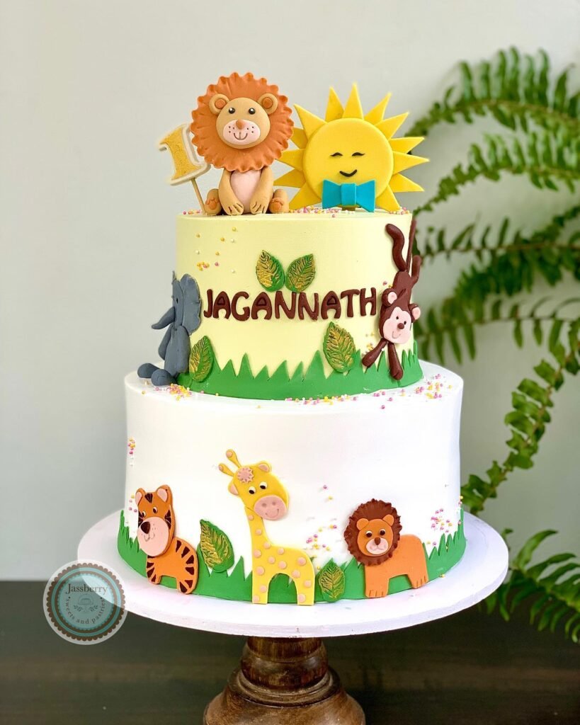 This adorable two-tiered cake combines a safari adventure with a bright sunshine birthday party theme, making it extra special. A friendly lion and a cheerful sun wearing a bowtie adorn the top, signaling a joyous celebration. The “1” candle clearly marks a precious first birthday.