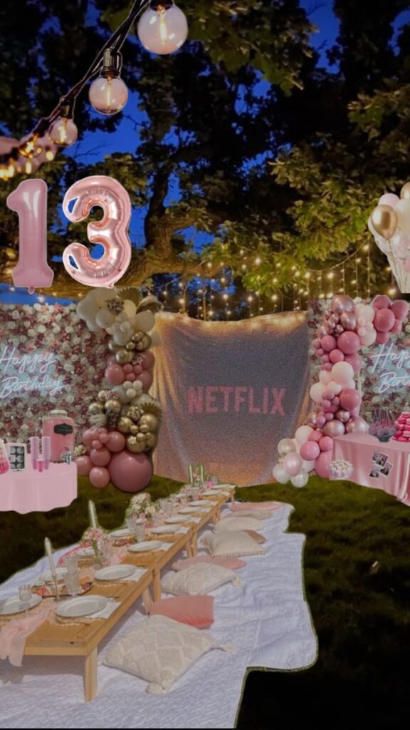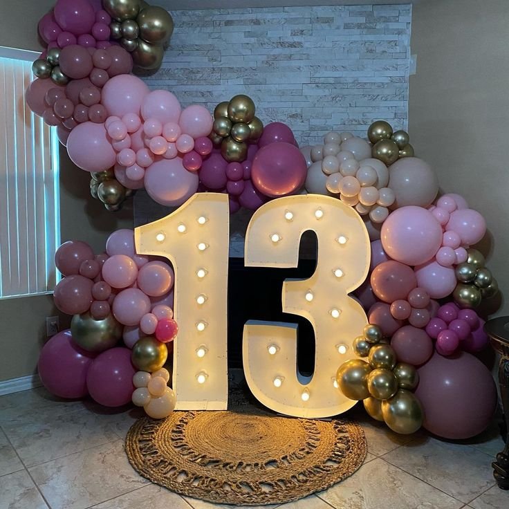 Adorn the table with delicate pink runners and individual place settings, making each guest feel special. Large, illuminated “13” numbers add a dazzling focal point, celebrating the milestone birthday in style. Pink balloons in various shades create a beautiful, organic arch, enhancing the festive mood.