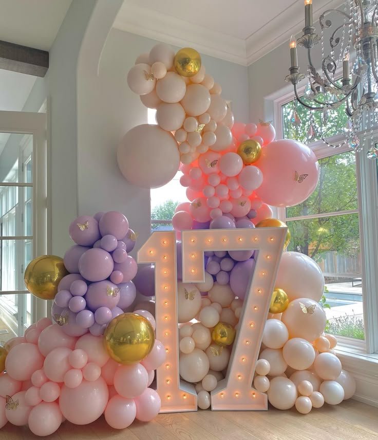 Celebrate a special seventeenth birthday with a dreamy and elegant balloon display, a beautiful teen birthday party idea. Illuminated “17” marquee numbers stand brightly, creating a stunning focal point that signifies this milestone year. The warm glow adds a touch of magic to the setting.