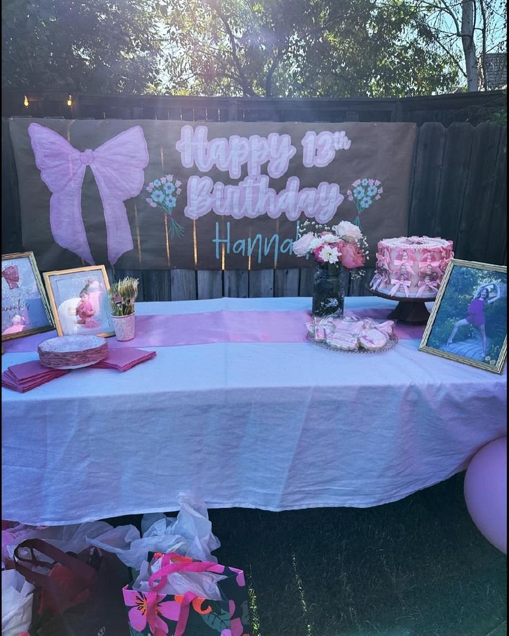 Celebrate Hannah’s 13th birthday with a charming and personalized outdoor setup, a fantastic teen birthday party idea. A rustic banner with a large pink bow, “Happy 13th Birthday Hannah,” and delicate floral accents serves as a sweet focal point. This handmade touch makes the celebration feel extra special.