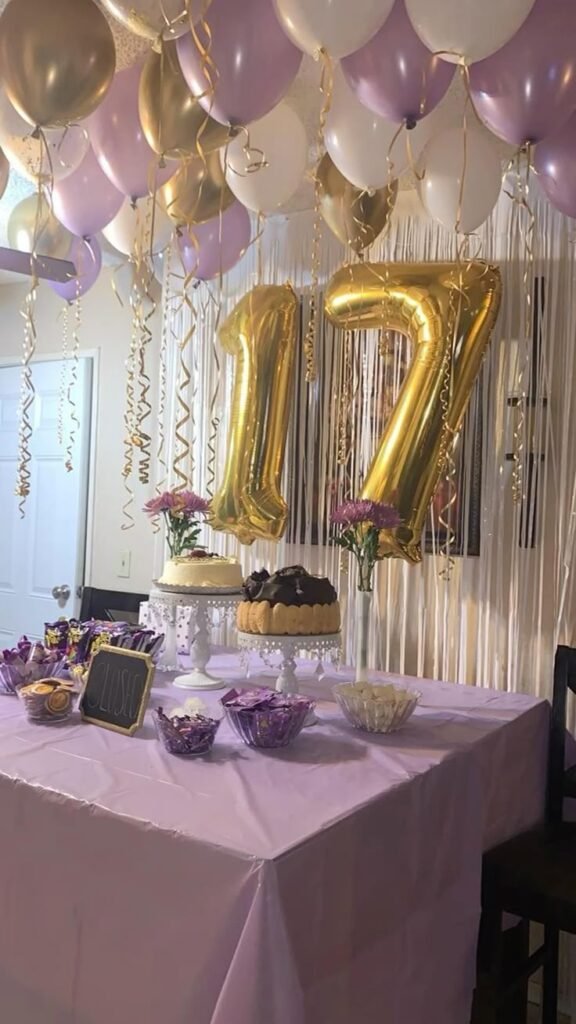 Set a stylish scene with a dessert table adorned in elegant purple and gold, a truly chic teen birthday party idea. A soft lavender tablecloth provides a refined base for an array of sweet treats. Gold foil “17” balloons prominently float above, signifying the special age.