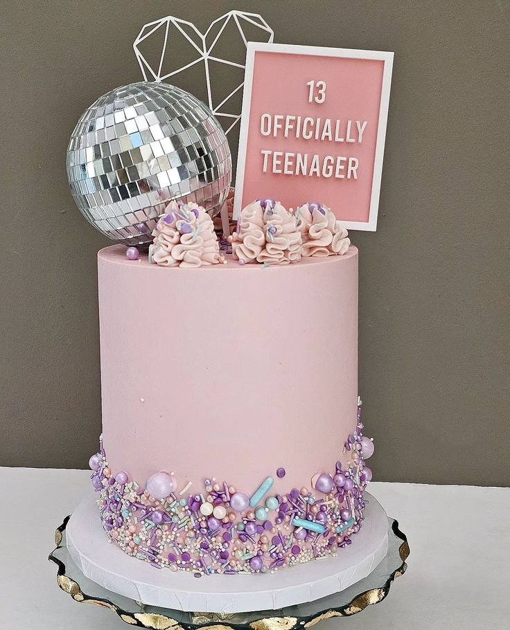 Topping the cake are whimsical swirls of frosting, complemented by a miniature disco ball that promises fun and dancing. A framed message board proudly declares “13 OFFICIALLY TEENAGER,” marking this significant milestone. A geometric heart wireframe adds a touch of modern charm.