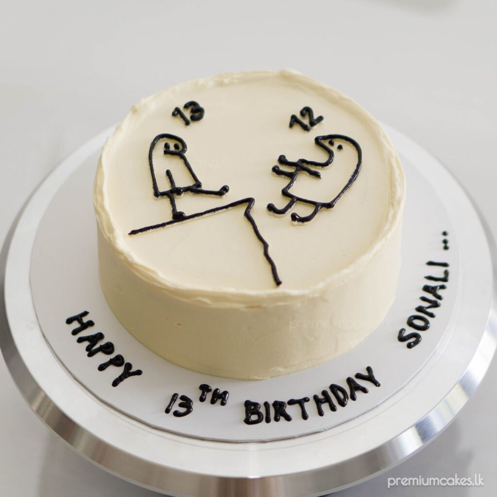 The simple yet elegant design allows the witty illustration to stand out. A smooth, creamy frosting provides the perfect canvas for the hand-piped details. The message “Happy 13th Birthday Sonali” is neatly inscribed around the base, making it uniquely hers.