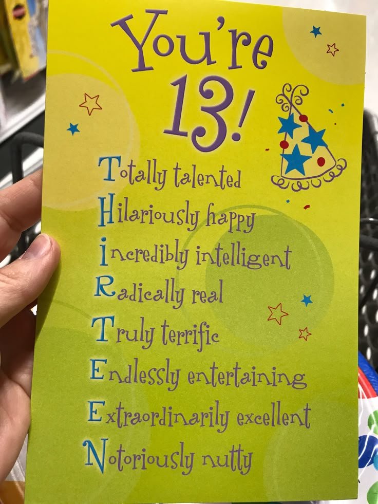 Finding the right words for a special teen’s birthday becomes easy with a fun acrostic card, a thoughtful teen birthday party idea. This vibrant yellow card celebrates the age 13 with a playful and personalized message. Each letter of “THIRTEEN” begins a positive adjective, describing the birthday person.