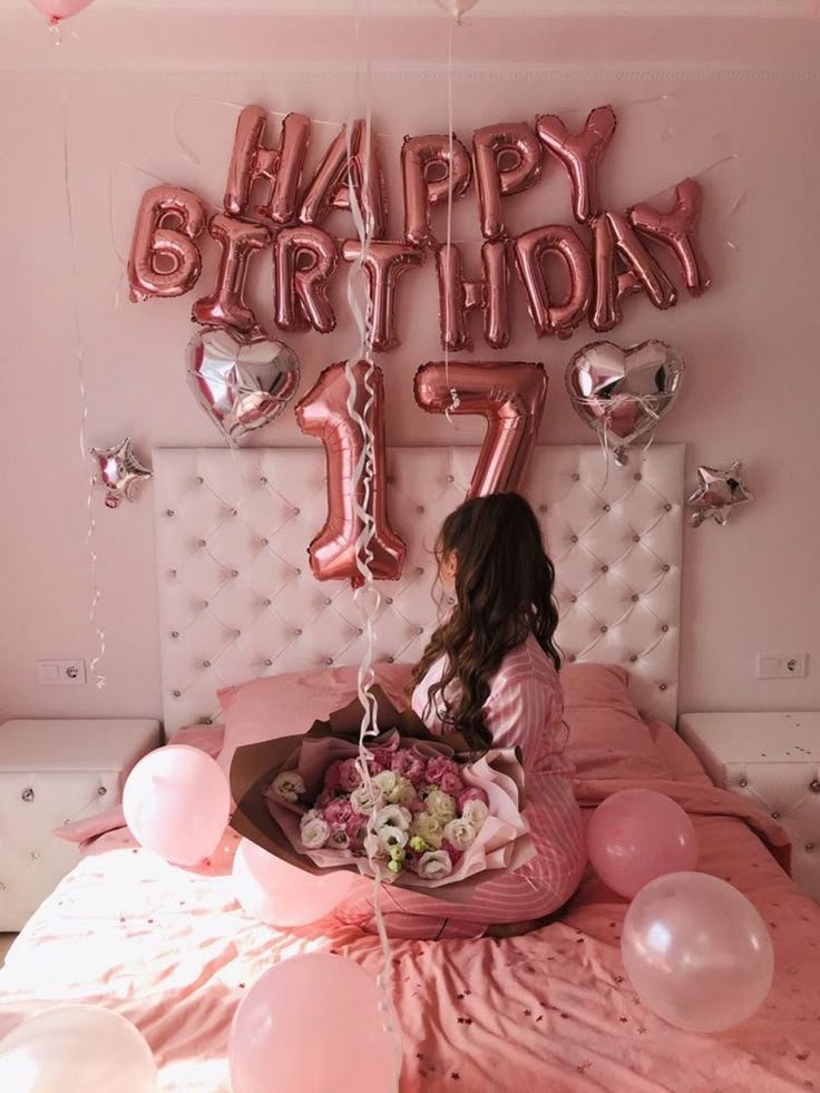 Large rose gold foil “17” balloons prominently mark the milestone birthday, flanked by shiny silver heart and star balloons. The birthday person sits on the bed, holding a beautiful bouquet of pink and white flowers, clearly enjoying the special moment.