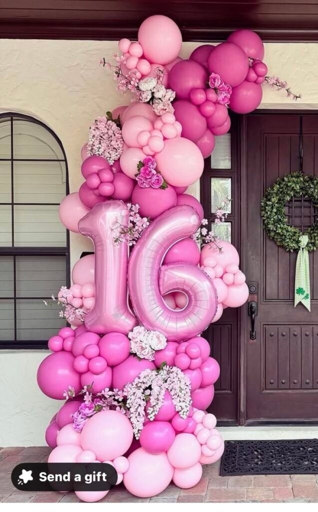 Prominently featured are large, shimmering pink foil “16” balloons, announcing the special milestone with flair. Delicate artificial flowers and greenery are artfully integrated into the balloon clusters, adding a touch of natural beauty and sophistication. This floral addition enhances the festive atmosphere.
