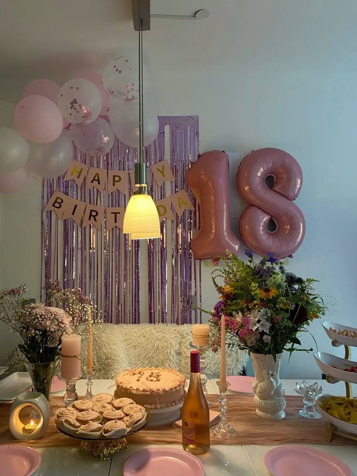 Behind the table, a shimmering purple tinsel curtain serves as a festive backdrop, adding sparkle and depth. Pink foil “18” balloons boldly announce the milestone, while a “Happy Birthday” banner completes the celebratory wall decor. Balloons in soft pink and white, some with confetti, float above.